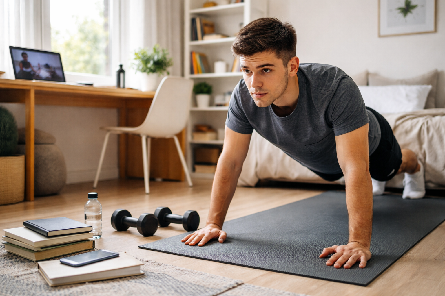 Student doing home workout near study desk showing weight loss tips for students at home